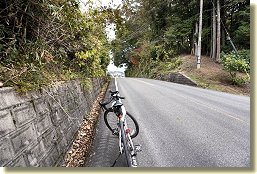 仁賀の信号交差点を過ぎて、真っ直ぐな急坂を眺める。とても登れない、自転車を降りて歩いて進む。